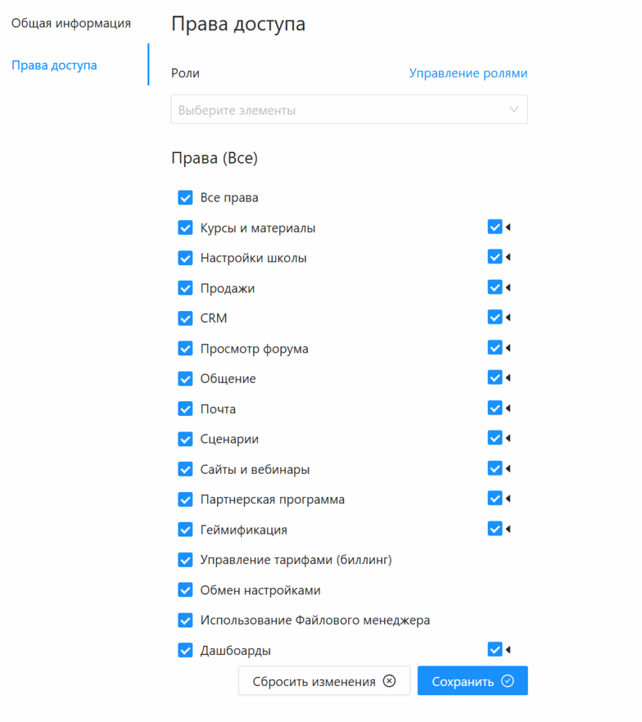 Также на этой вкладке можно ограничивать права сотрудников, если это необходимо. Список прав достаточно большой, можно настроить его так, как вам это нужно.